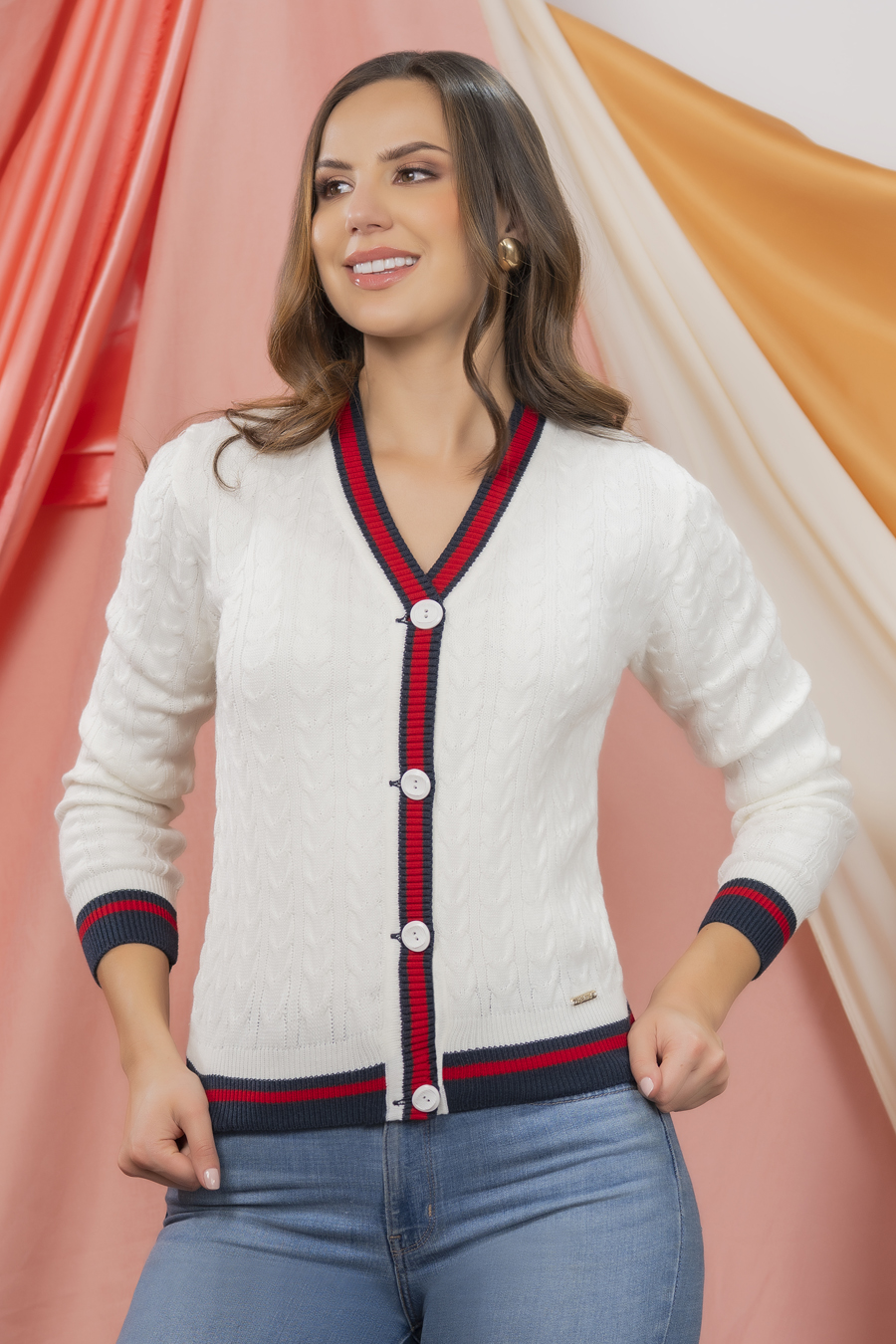 Saco Moderno Juvenil Dama. Nuestro exclusivo saco combina estilo y comodidad en una sola prenda. Este elegante saco presenta un  elegante orillo contrastante en cuello, puños  y parte de abajo que añade un toque moderno y dinámico a tu look. Confeccionado en hilo 100% acrílico.